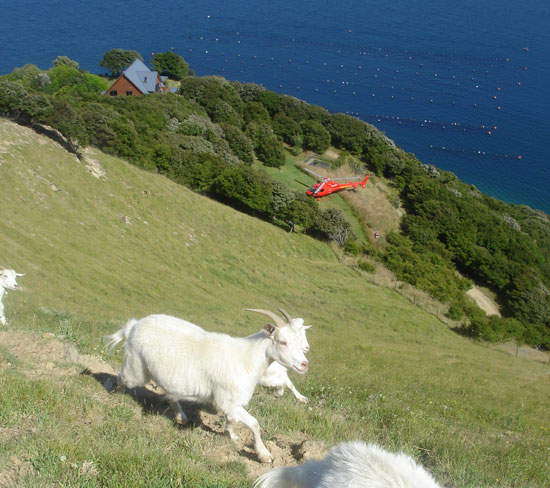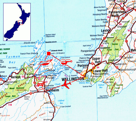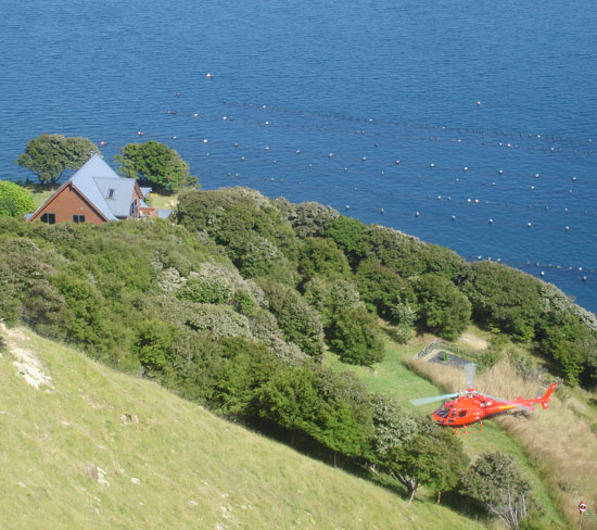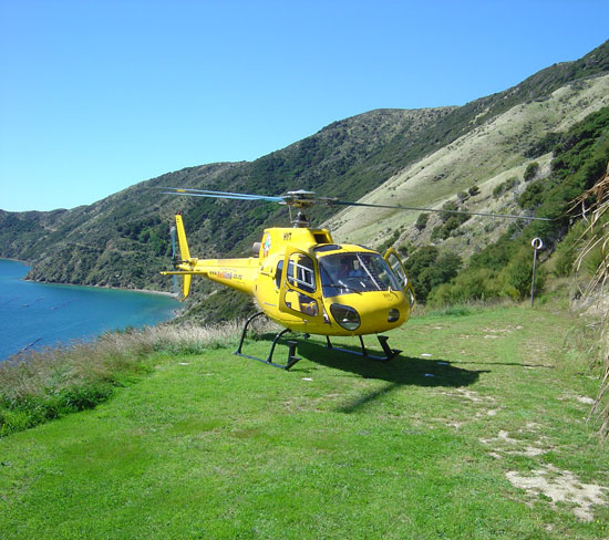 The helicopter flight from Wellington takes only about 20 minutes. The helicopter can land on the helipad adjacent to the guest lodge (approx. EUR 5,500 plus tax for 6 persons/way)